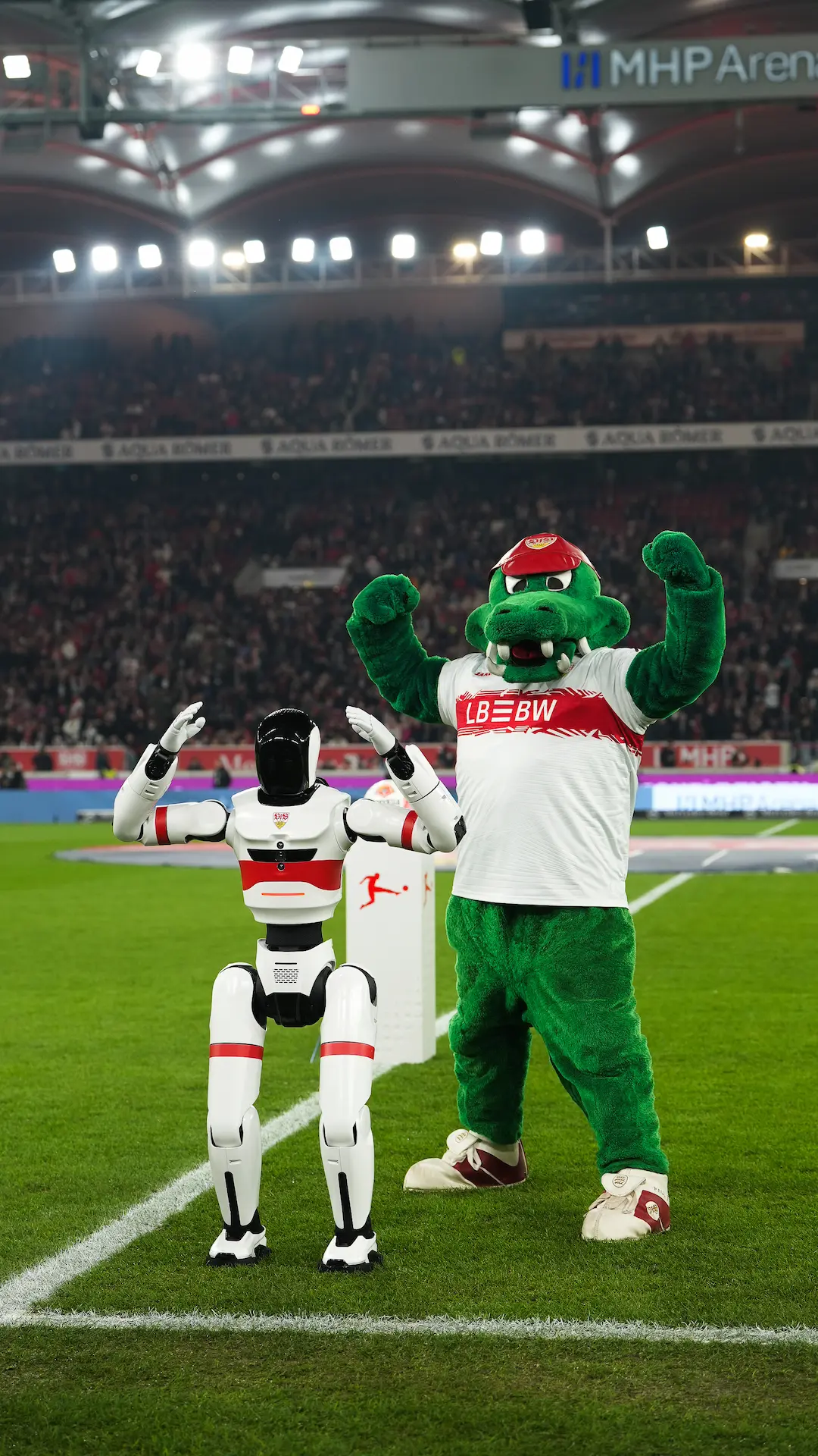 Metzingen, Germany – March 15, 2026 – During Sunday’s Bundesliga top match between VfB Stuttgart and RB Leipzig, a humanoid robot became part of the on-field action for the first time. The 4NE1 Mini (“For Anyone”) from NEURA Robotics supported both interviews with VfB legends and the ceremonial kickoff as part of the club’s “Innovation Match Day.” Equipped with cognitive capabilities such as vision, hearing, and tactile sensing, the robot performed tasks requiring precision, timing, and interaction. It handed VfB legend Sami Khedira the microphone for his TV interview, carried the official match ball onto the pitch, and together with club mascot Fritzle recreated the famous “Undav pose” of VfB striker Deniz Undav. The moment symbolically united elite sport and technological excellence – made in Baden-Württemberg, Germany.
